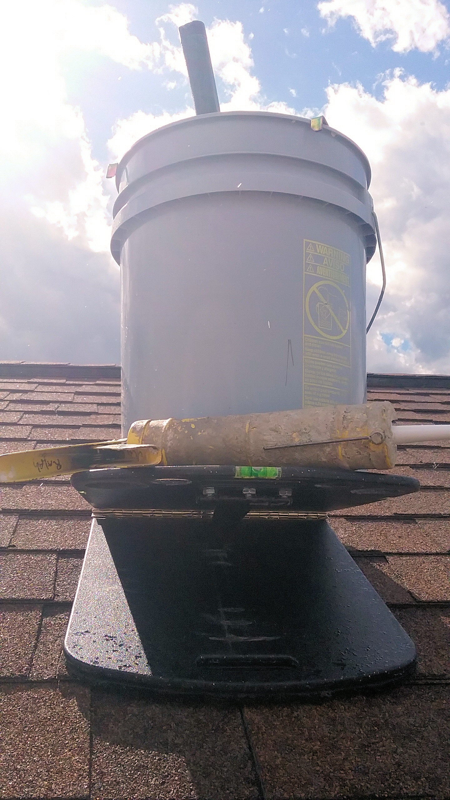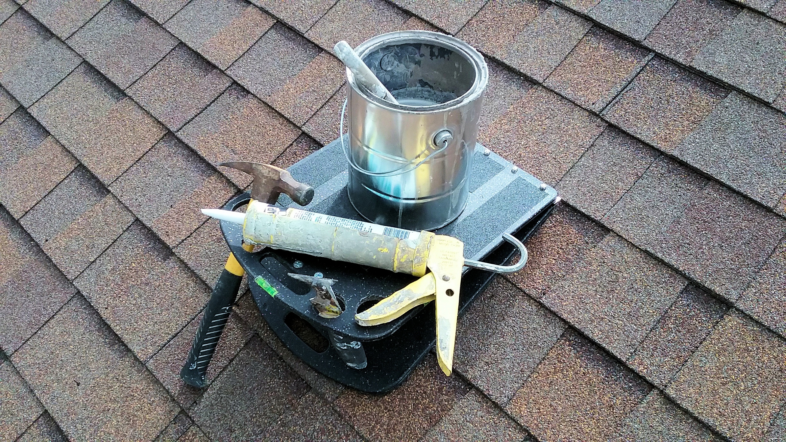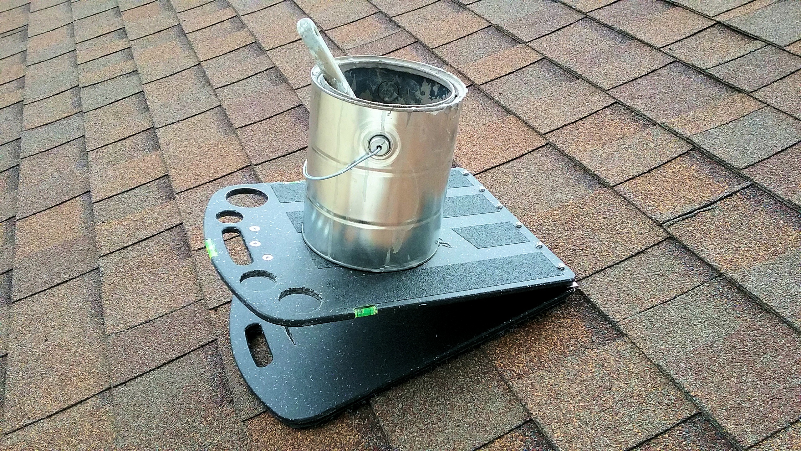 The Roof Rider is strong! With its strength harnessed in the steel hinge, the Roof Rider is capable of withstanding some weight. Although sitting on the Roof Rider is not recommended you can feel at ease knowing that while on a roof the Roof Rider will hold level and help prevent sliding of your tools or your one gallon paint cut can or even a five gallon bucket, removing the fear of sliding tools or spilled paint so you can concentrate on the job at hand.