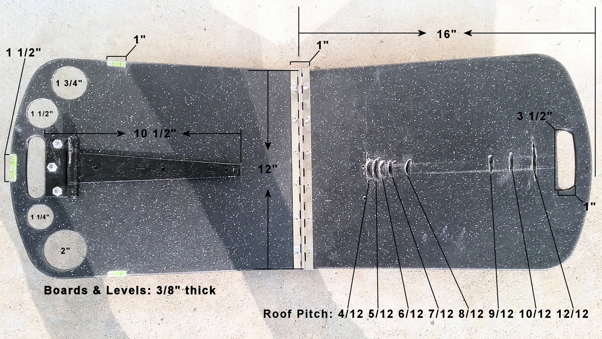 The Roof Rider was designed and built using pre-made materials purchased at local stores. The Roof Rider is a sleek, lightweight, portable tool designed and built with the ability to form a slide resistant, level work area on a sloped, shingled roof. With a quick, easy adjustment the Roof Rider can be set to accommodate 8 different roof pitches. |